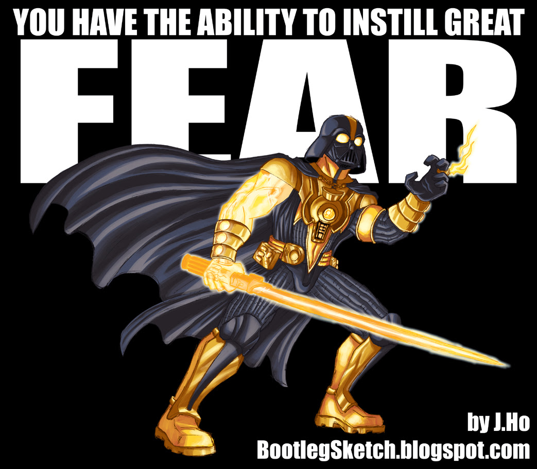 Before you protest--yes, I'm aware that this concept wouldn't really work in the continuity of either Star Wars or the DC Universe due to the fact that Darth Vader died a long time ago, in a galaxy far, far away... long before the Sinestro Corps had ever been formed. If I had to come up with an explanation, I would say that the ghost of Anakin Skywalker was psychically controlled/driven insane by Parallax, and had regressed into the psyche of Vader once more. With his spirit trapped in the hollow shell of his suit of armor, and powered by a yellow power battery, Darth Vader is now forced to serve the Sinestro Corps as perhaps their most powerful enforcer.